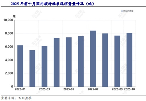 据百川盈孚数据,2025年1-12月,中国碳纤维实际消费量预计96446吨,同比上涨71.89%,其中增量主要集中于风电叶片及航空航天领域。