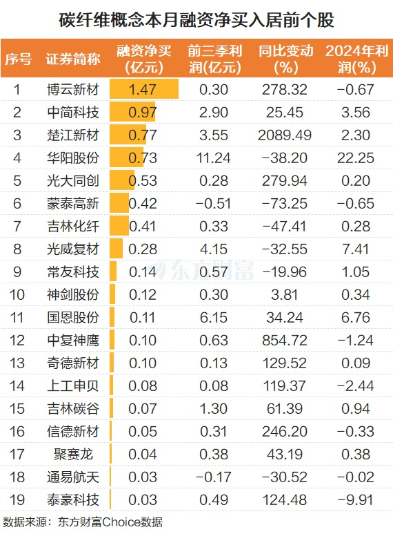 在产能跃升全球第一且需求量预期高增的背景下,碳纤维概念正受到市场的更多关注。比如博云新材,本月被杠杆资金融资净买入1.47亿元,该股前三季度业绩同比增长278.32%。还有中简科技,本月被融资净买入0.97亿元,前三季度业绩同比增长25.45%。楚江新材、吉林化纤、光威复材、中复神鹰、吉林碳谷等也在本月被杠杆资金积极抢筹。