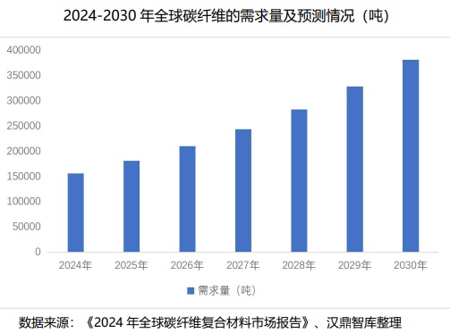 根据《2024年全球碳纤维复合材料市场报告》数据,2024年的全球需求数据为156100吨,同比增长了35.7%。预计到2030年达到381800吨,年均复合增长率为16%。而按金额统计的话,2024年航空航天军工占比最大为49%,其次是体育休闲 13.2%,然后是风电叶片占比 12.3%。