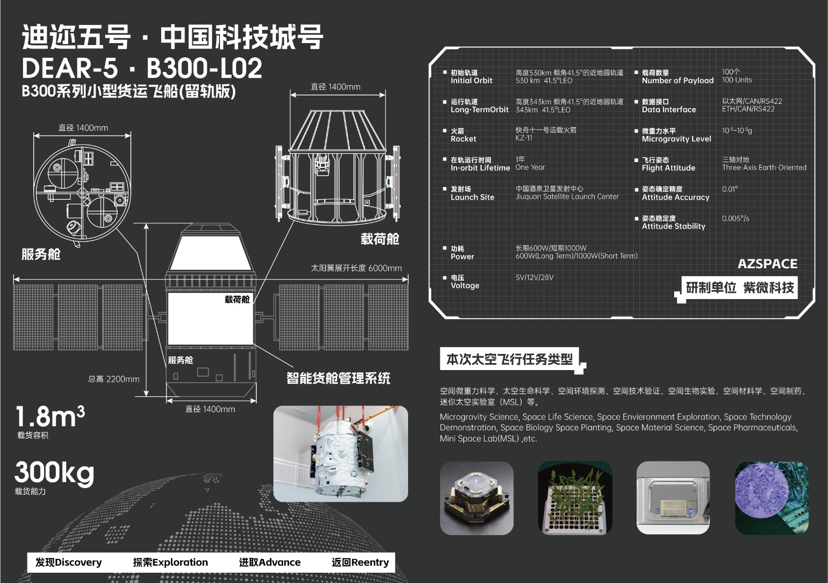 该飞船载荷承载能力300公斤、有效容积1.8立方米,发射轨道高度530公里,长期运营轨道434公里。此次搭载了科研机构、高校、企业等的科学试验载荷,将开展为期一年的34项载荷相关试验和平台任务。
