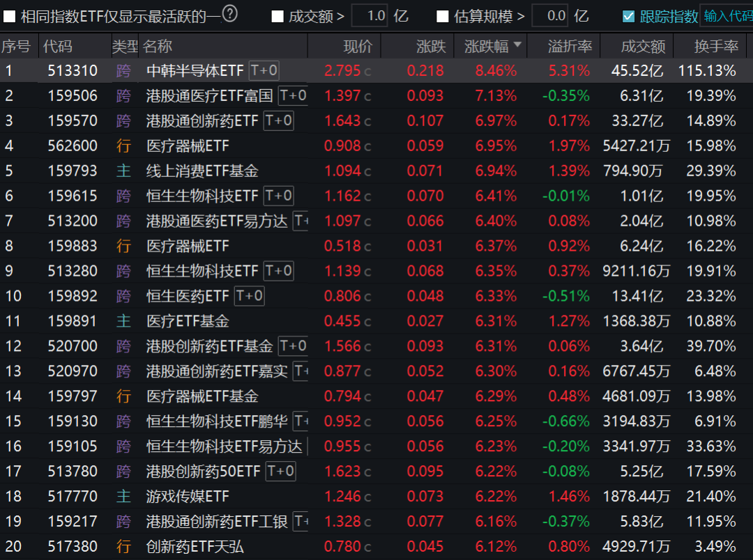 医药和半导体ETF大面积上涨