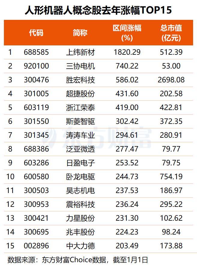 其中,上纬新材凭借超18倍的涨幅成为去年A股年度“涨幅王”,三协电机去年股价大涨7.4倍,在人形机器人概念板块中位居涨幅榜次席,胜宏科技去年也大涨586%,超捷股份、浙江荣泰年度涨幅均超4倍,斯菱智驱、卧龙电驱、昊志机电等10股区间涨幅均在两倍以上。