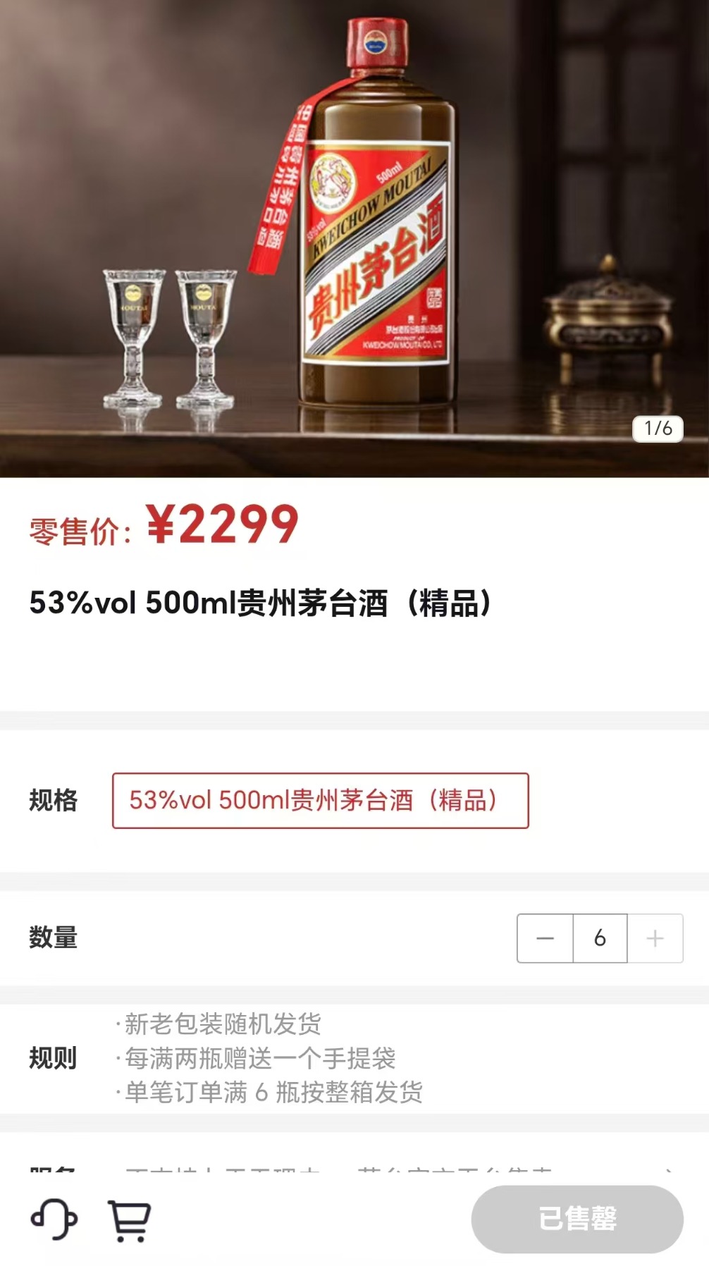 i茅台持续上新。1月9日9点多,i茅台53%vol 500ml贵州茅台酒(精品)上新首日迅速售罄。该酒售价为2299元/瓶。