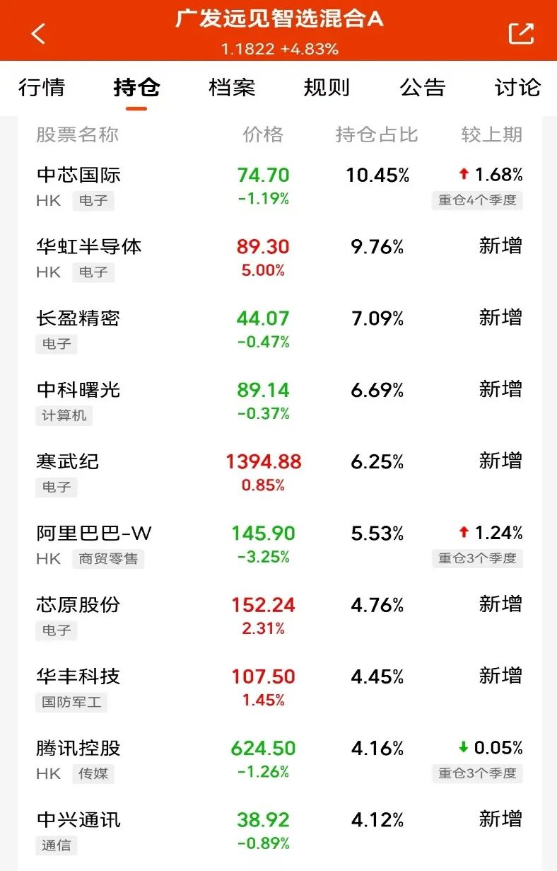 类似的还有唐晓斌管理的广发远见智选混合基金,1月7日,该基金净值大涨4.83%,但从2025年三季度末的基金前十大重仓股的市场表现看,1月7日有6只个股下跌,涨幅最高的华虹半导体上涨5%。