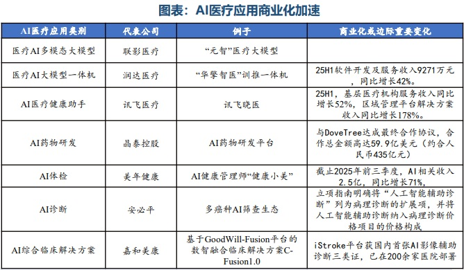 从商业化进程来看,智谱、MiniMax的上市使中国AI企业首次在资本市场节奏上领先于OpenAI、Anthropic等美国巨头,标志着中国大模型产业从“技术竞赛”进入“资本验证”的新阶段。此外,美年健康、润达医疗、讯飞医疗科技等公司加速推出垂类大模型,或推出轻量级一体机等新推广模式,同样呈现出商业化加速趋势。
