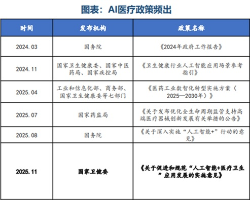 从政策上看,我国的AI医疗政策频出,比如2025年8月国务院发布了《关于深入实施“人工智能+”行动的意见》,要求把人工智能(AI)深度融入辅助诊疗、健康管理、医保服务等场景,全面提升基层医疗健康服务能力和效率。