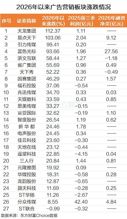 个股而言,以申万广告营销板块为例,2026年以来表现强势,截至1月14日早盘收盘,天龙集团、易点天下翻倍,分别上涨112.37%和103.06%。引力传媒、蓝色光标、浙文互联、省广集团、天下秀也表现强势,涨幅均超50%。