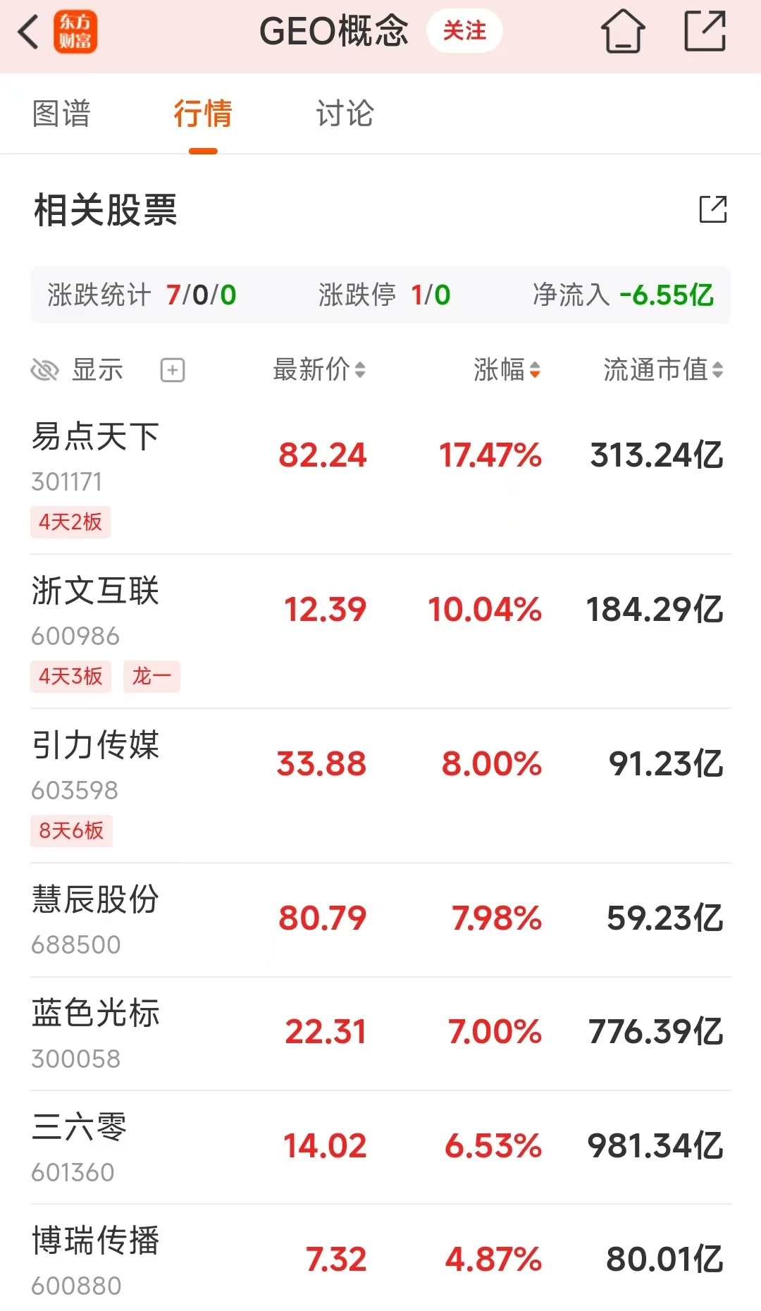 1月14日早盘GEO概念继续走强,板块中浙文互联(4天3板)涨停;易点天下大涨超10%;引力传媒、慧辰股份、蓝色光标也大幅上涨。