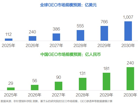 而根据秒针营销科学院的测算,2025年全球及中国GEO市场规模预计分别达112亿美元和29亿元,到2030年,两者有望分别增长至1007亿美元和240亿元。