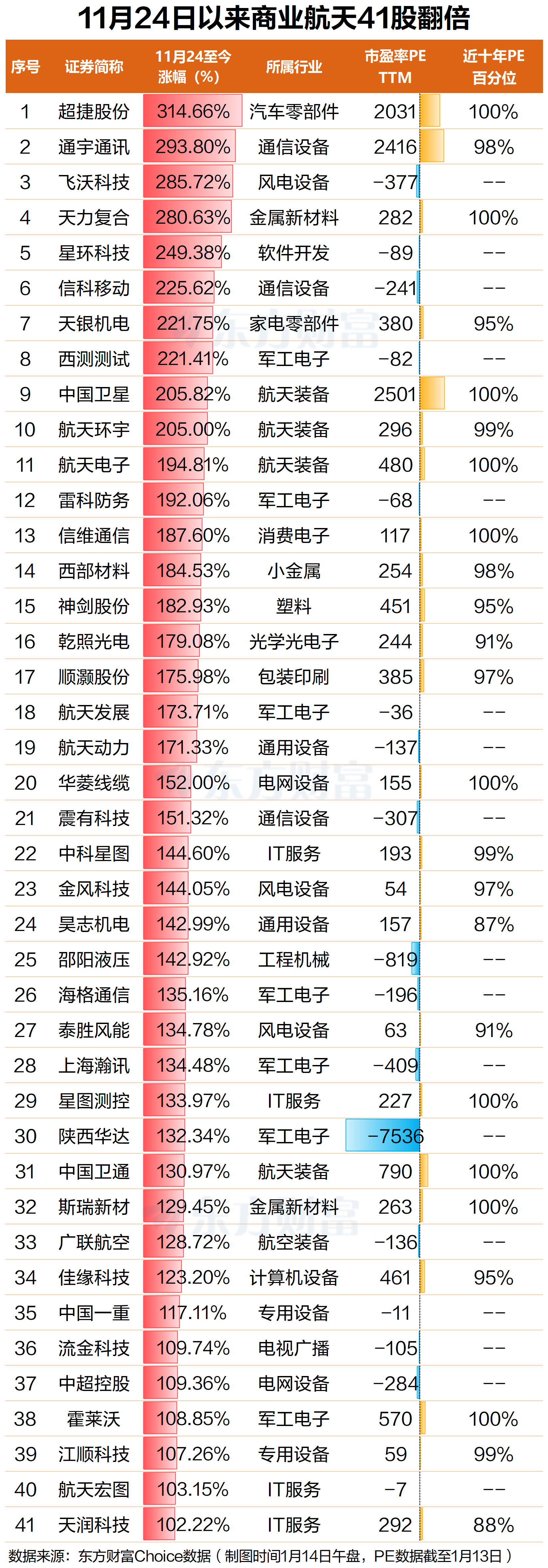 1月14日,商业航天概念再掀涨停潮,截至早间收盘,板块大涨3.59%。个股方面,七丰精工、流金科技30CM涨停,佳缘科技20CM涨停,星环科技-U、中科星图、震有科技、龙芯中科、新劲刚、星图测控、上海瀚讯、易事特涨超10%,烽火电子、九鼎新材、长缆科技、大唐电信、中国一重、海格通信、江顺科技、能科科技、三维通信、中航重机、盛路通信、金隅集团等十余股涨停。