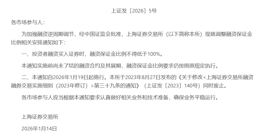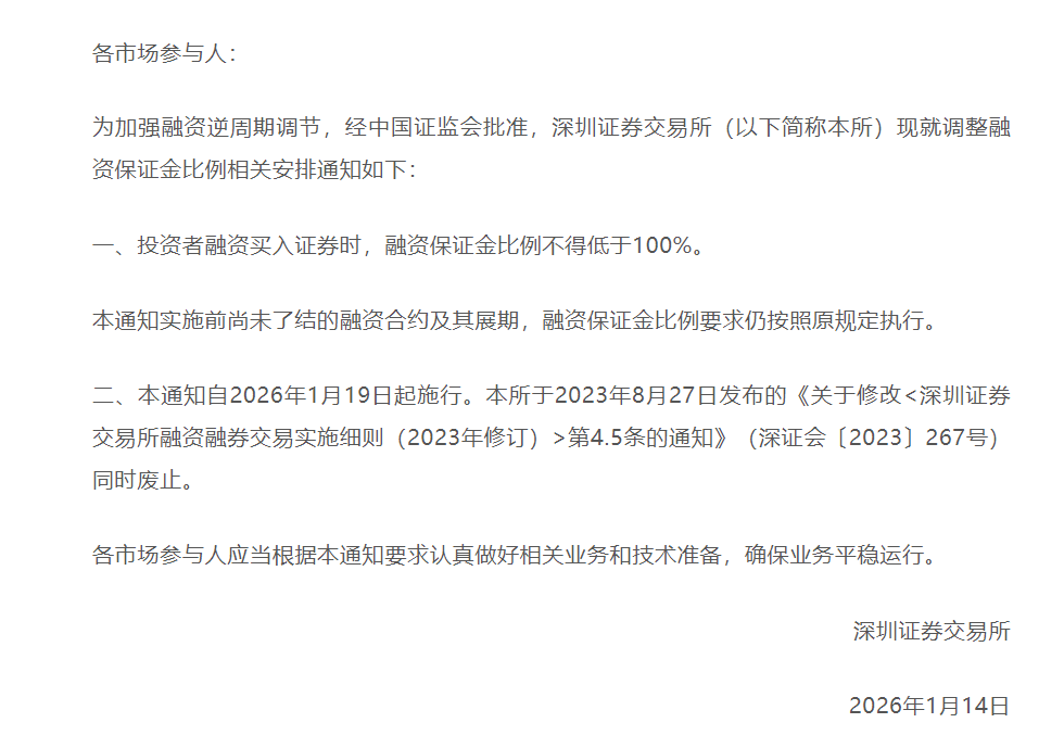1月14日,经中国证监会批准,沪深北交易所发布通知调整融资保证金比例,将投资者融资买入证券时的融资保证金最低比例从80%提高至100%。