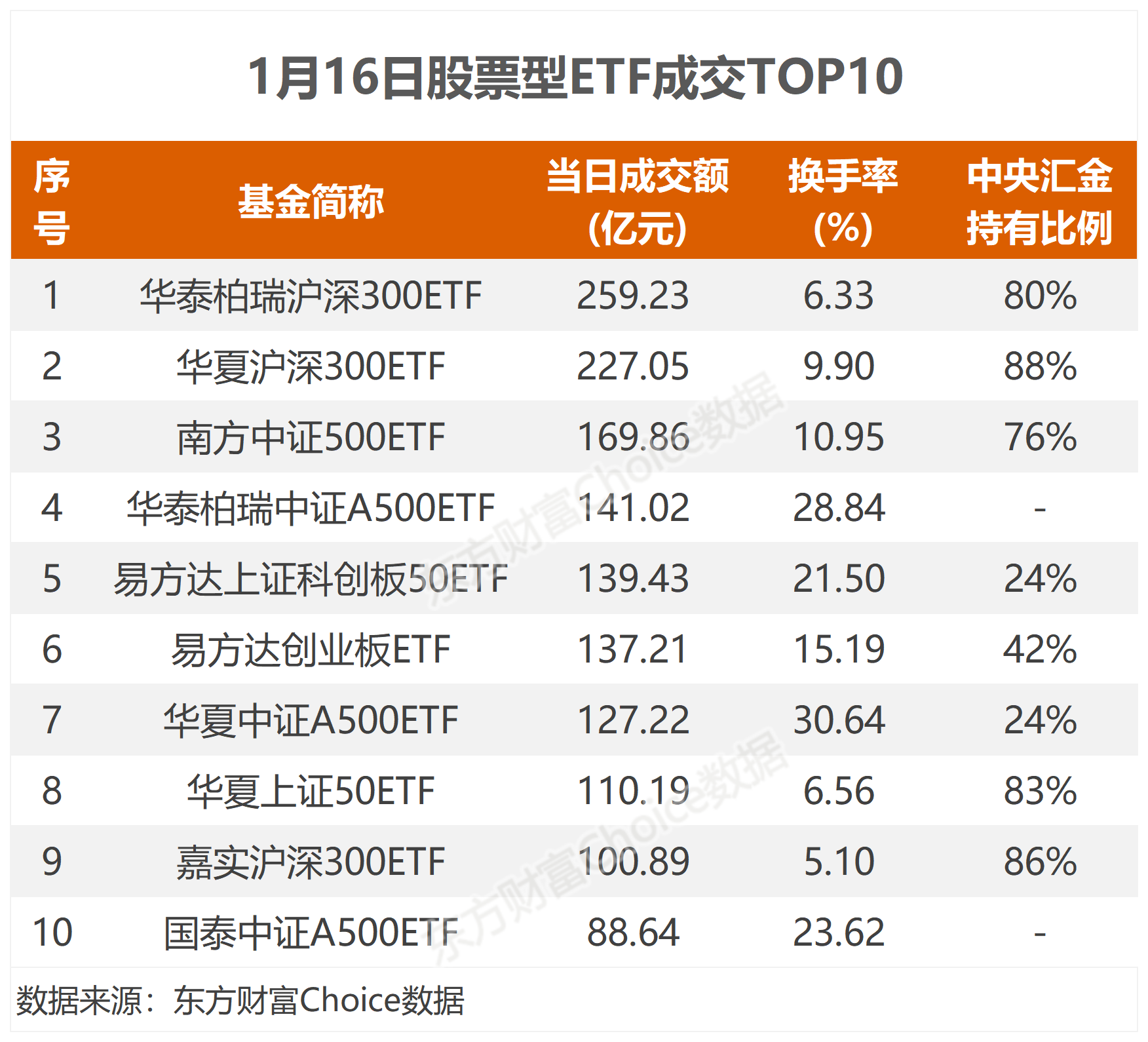 除去非股票型ETF,当天成交额最大的ETF分别是华泰柏瑞沪深 300 ETF、华夏沪深 300 ETF、和南方中证 500 ETF,成交额分别为259.23亿元、227.05亿元、169.86亿元。