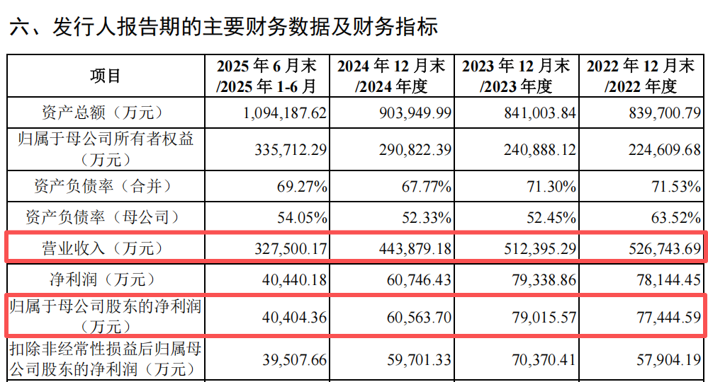 2022年至2024年及2025年上半年,振石股份的营业收入分别为52.67亿元、51.24亿元、44.39亿元及32.75亿元,归母净利润分别为7.74亿元、7.90亿元、6.06亿元及4.04亿元。