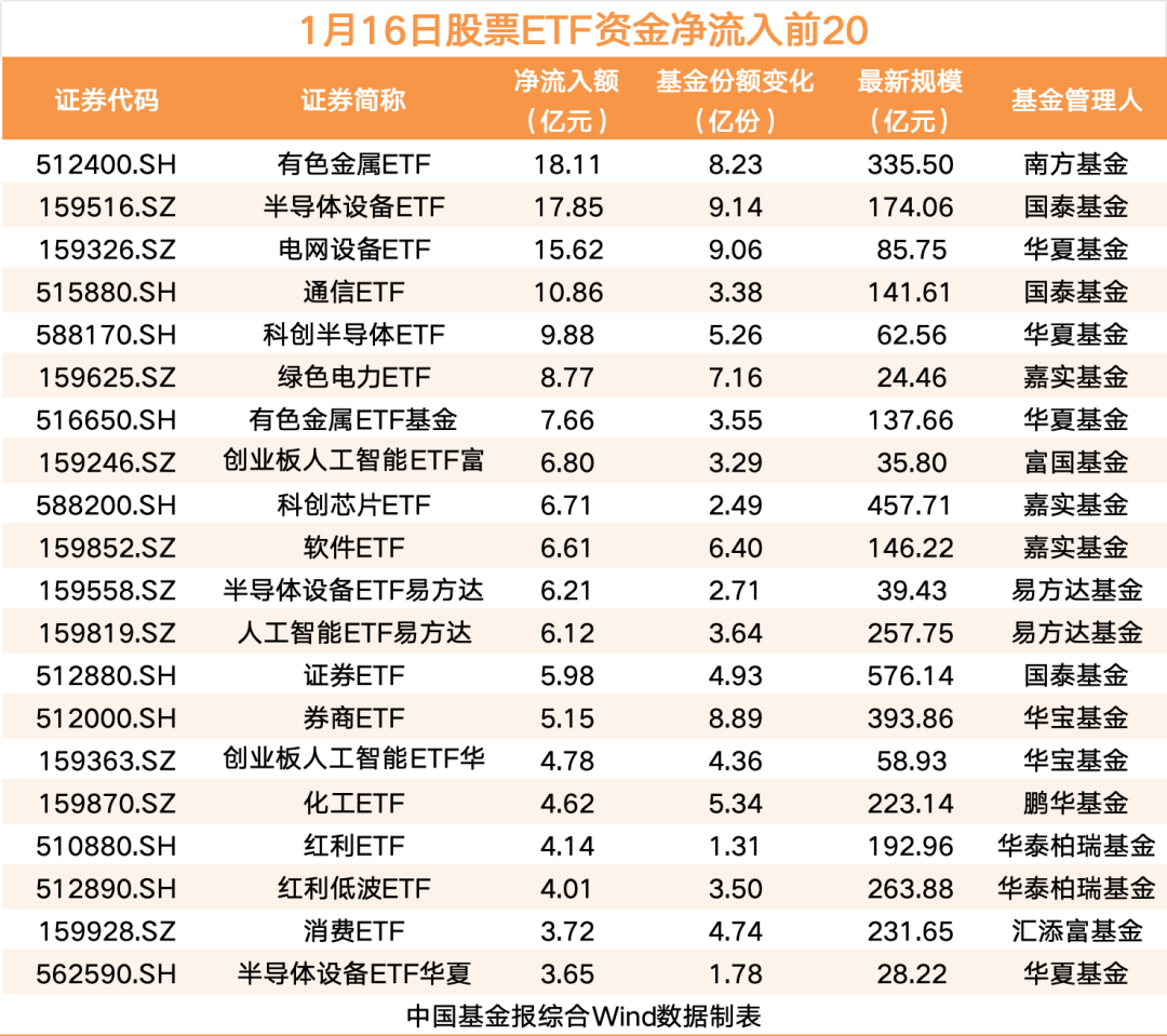具体来看,1月16日共有57只ETF资金净流入超1亿元。其中,有色金属ETF、半导体设备ETF、电网设备ETF依次位列前三,资金净流入分别为18.11亿元、17.85亿元和15.62亿元。