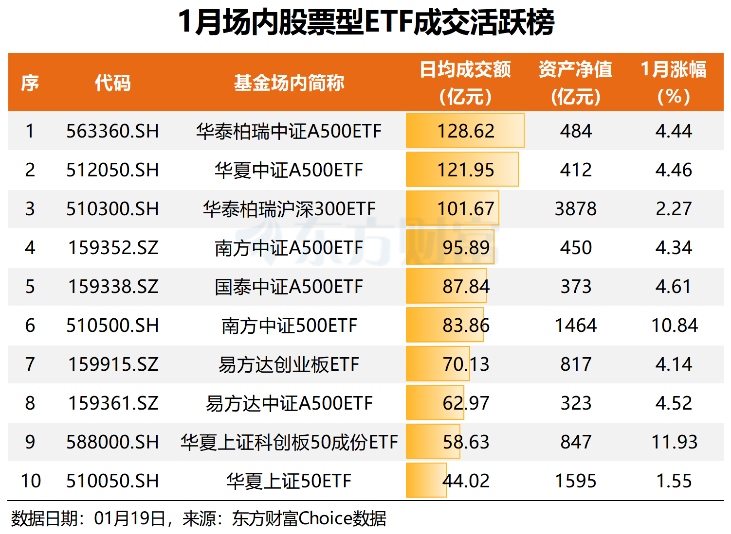 从日均成交额来看,当前最活跃的股票ETF为华泰柏瑞中证A500 ETF,当月日均成交额128.62亿元;华夏中证A500 ETF紧随其后,当月日均成交额121.95亿元;华泰柏瑞沪深300ETF第三,当月日均成交额101.66亿元。