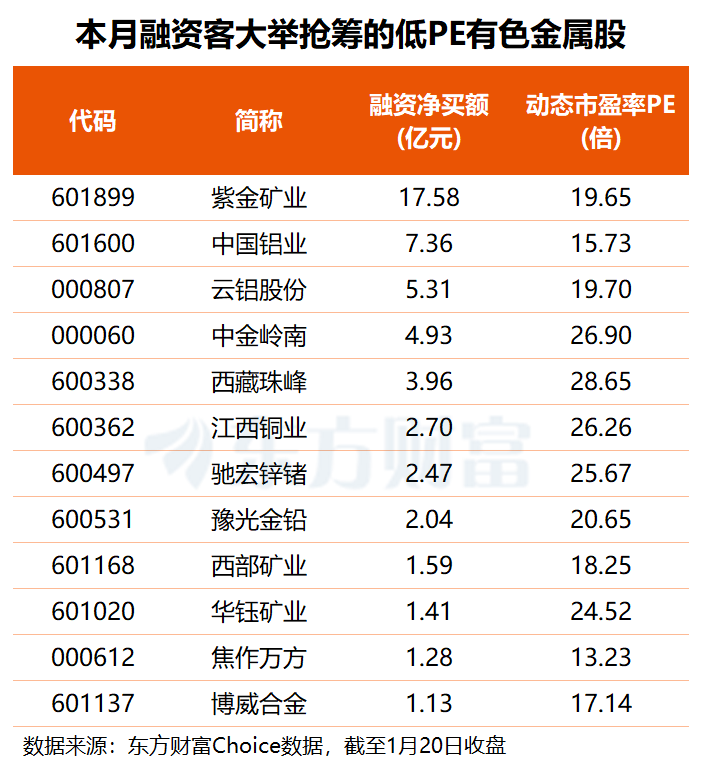 上述21股中,板块龙头紫金矿业获杠杆资金大幅加仓17.58亿元,中国铝业、云铝股份分别获融资客抢筹7.36亿、5.31亿元;中金岭南、西藏珠峰、江西铜业等5股的融资净买额均在2亿至5亿元之间,西部矿业、华钰矿业、焦作万方、博威合金也获融资净买入超1亿元。