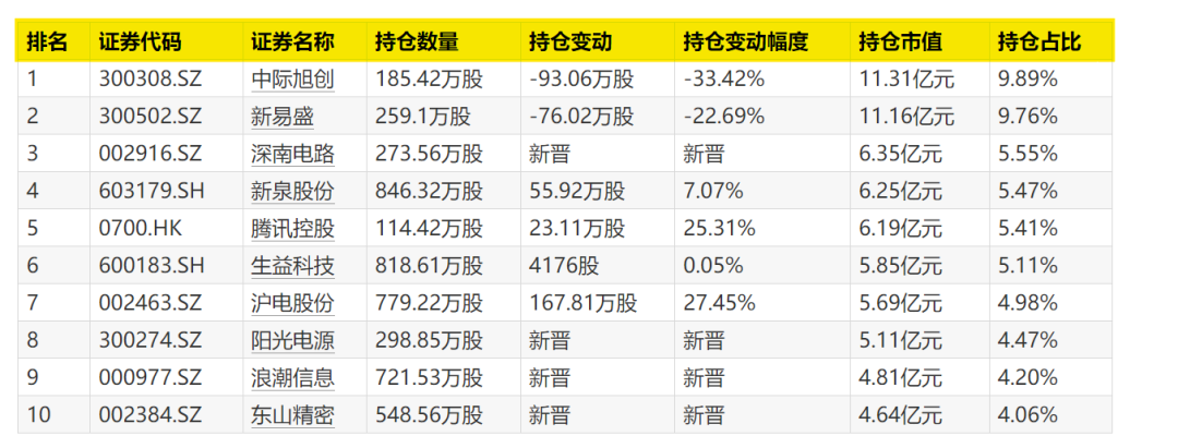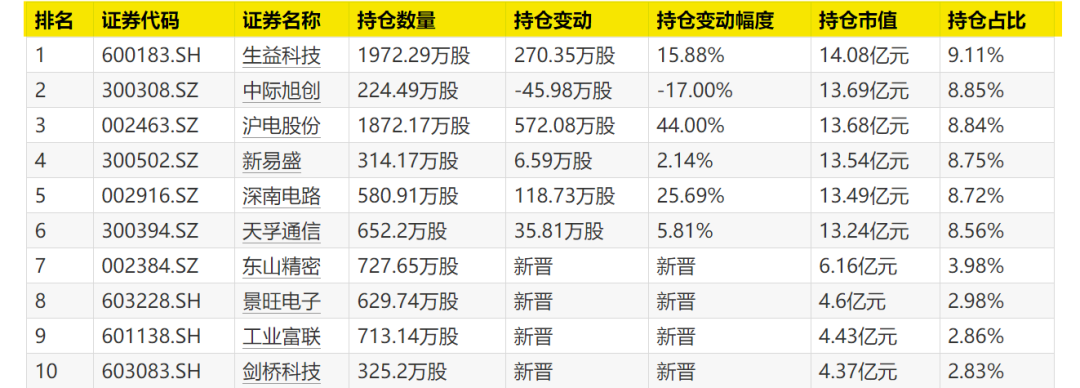 深南电路、阳光电源、浪潮信息、东山精密新晋十大重仓股之列。