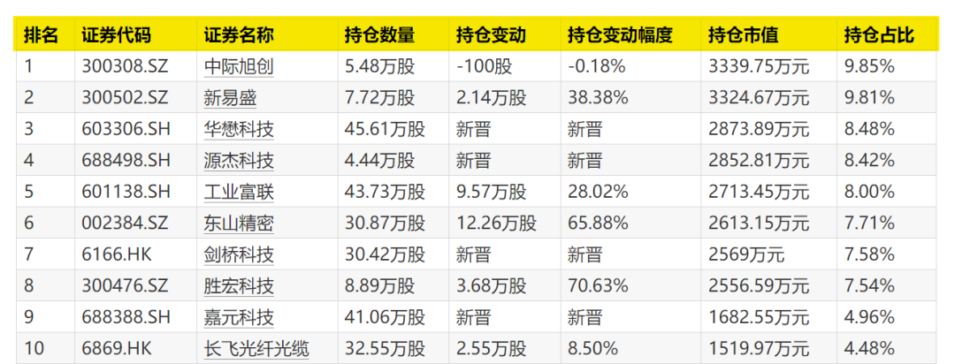 中际旭创被小幅减持,华懋科技、源杰科技、剑桥科技、嘉元科技新晋十大重仓股。