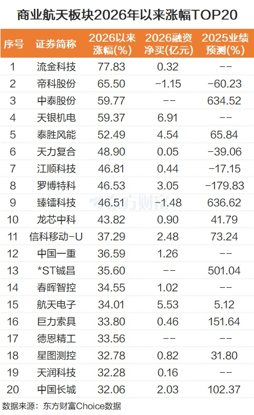 从杠杆资金角度看,商业航天板块2026年以来涨幅前20个股中,不少个股被积极抢筹。比如天银机电,被融资净买入6.91亿元。航天电子被融资净买入5.53亿元。泰胜风能、罗博特科、信科移动-U、中国长城、中国一重、春晖智控也被融资净买入居前。
