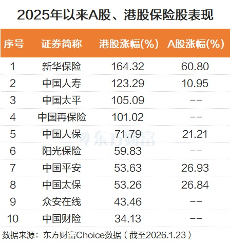 2025年以来,保险股整体强势,尤其多只在香港上市的保险股,已是翻倍。比如港股的新华保险,2025年以来大涨164.32%。港股的中国人寿,2025年以来大涨123.29%。港股的中国太平和中国再保险也是翻倍。
