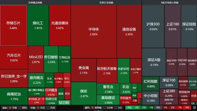 存储芯片、光通信模块、汽车芯片板块涨幅均超过3%,航空航天装备、贵金属也大涨,但煤炭、农业领跌。