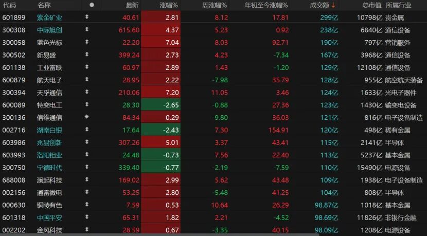 市场个股跌多涨少,上午更是一度超过4000只个股飘绿。截至收盘,3454只个股收跌,跌停股12只;1928只个股收涨,涨停股59只。15只个股日成交额超过100亿元,紫金矿业涨近3%,日成交额299亿元;光模块龙头“易中天”强势归来,中际旭创涨幅超过4%,新易盛涨近3%,天孚通信涨逾7%。此外,蓝色光标涨逾7%,兆易创新涨幅超过5%。
