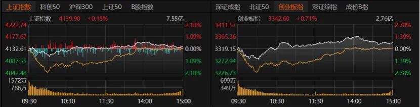 A股早盘一度下挫,随后震荡回升。指数表现分化,沪指微涨0.18%报4139.9点,创业板指收涨0.71%报3342.6点,深证成指、上证50微红,沪深300、北证50微绿,科创50收涨1.51%。