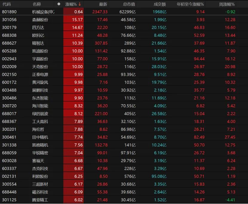7只机械设备个股涨停,森赫股份、四方达、欧科亿、精智达大涨,凯迪股份、宇晶股份、天奇股份、正泰电源、黄河旋风、展鹏科技涨停。