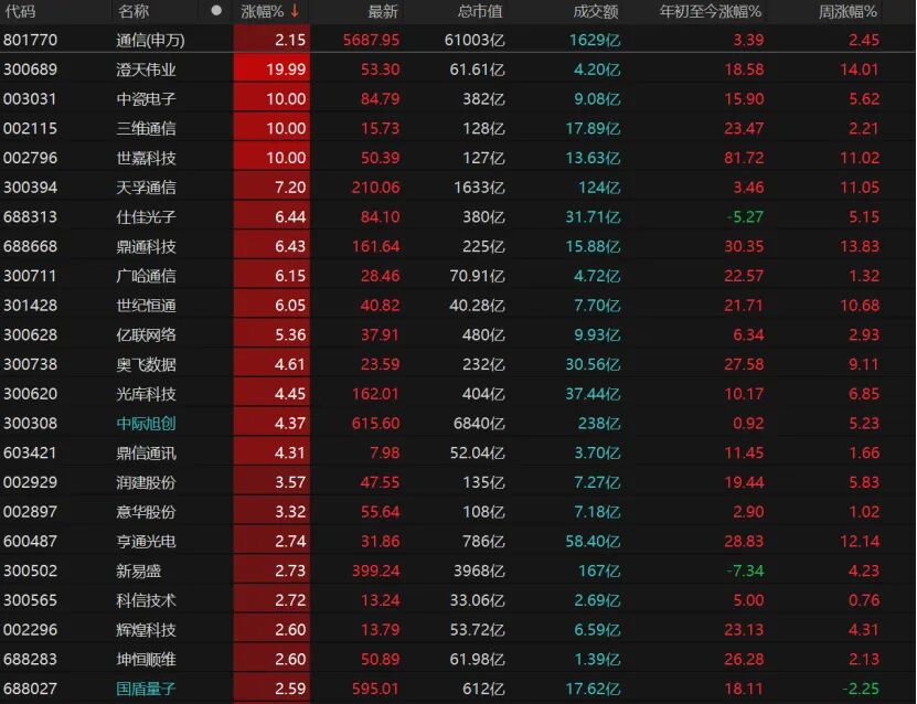 通信个股也表现不错,澄天伟业“20cm”涨停,中瓷电子、三维通信、世嘉科技涨停。
