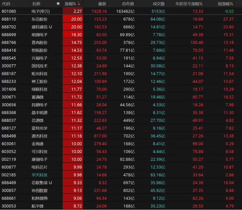 7只电子股涨停,东芯股份、盛科通信-U“20cm”涨停,明微电子、普冉股份、恒烁股份、兴福电子、国民技术、炬光科技、神工股份均大涨,金海通、可川科技、康强电子、电科芯片、华天科技涨停。