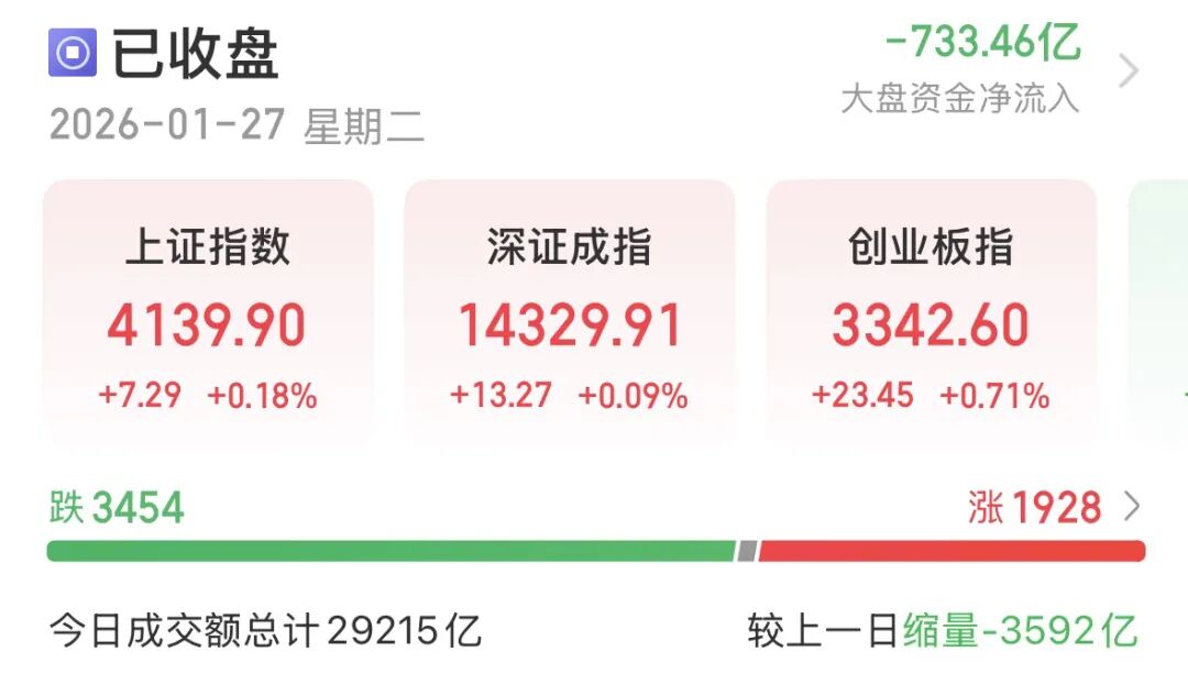 市场成交额较前一交易日缩量3593亿元,为2.92万亿元。杠杆资金方面,截至1月26日,沪深京三市两融余额增至2.73万亿元。