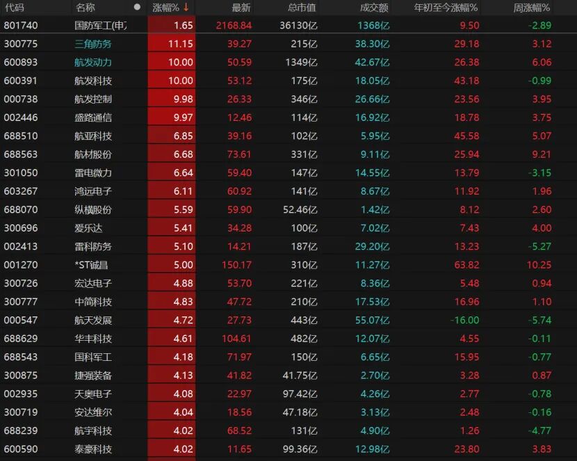 国防军工个股来看,三角防务涨逾11%,航发动力、航发科技、航发控制、盛路通信涨停。