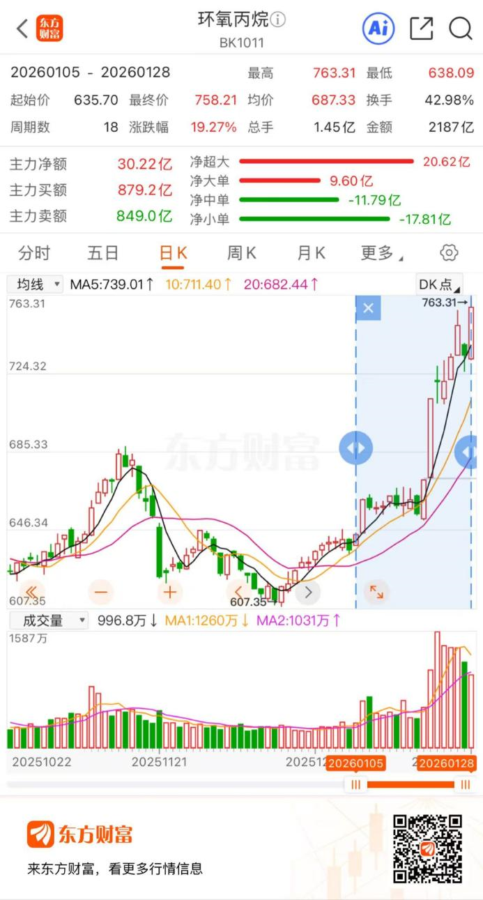1月28日,化工股异动,其中环氧丙烷方向涨幅居前,截至早间收盘,环氧丙烷概念上涨3.32%,2026年以来,该板块已涨超17%。个股方面,当日美邦科技涨超10%,卫星化学涨超8%,维远股份涨近6%,瑞华技术、万华化学、滨化股份等涨超4%,中国化学、齐翔腾达等涨超3%。
