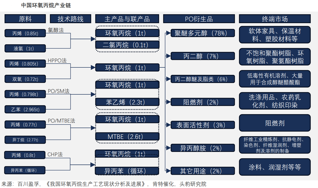 环氧丙烷(PropyleneOxide,PO)是石油化工重要中间体,主要通过丙烯氧化制得。其下游应用分布为:聚醚多元醇(78%),丙二醇(7%),丙二醇醚及酯类(6%),表面活性剂(3%),阻燃剂(2%),异丙醇胺(2%)及其他用途(2%)。这些产品广泛应用于聚氨酯、油田化学品、农药乳化剂、润滑油添加剂等领域。