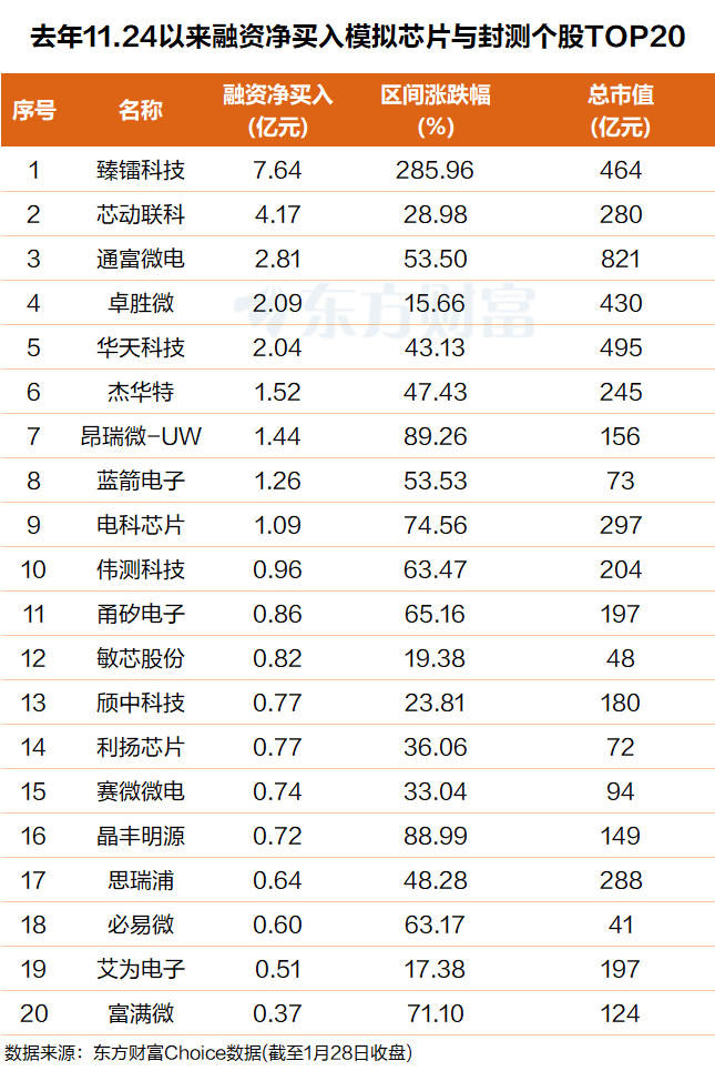 具体来看,臻镭科技排名第一,融资净买入7.6亿元;芯动联科排名第二,融资净买入超4亿元。