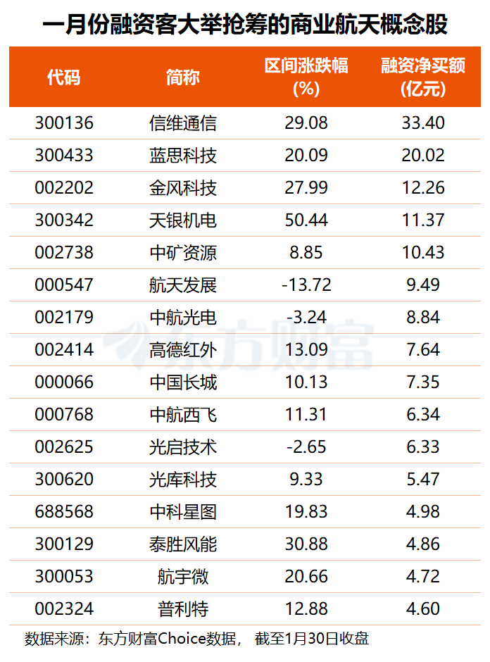 在刚刚过去的一月份,商业航天板块急涨之后震荡回调,但板块月涨幅仍达7.41%,超六成概念股录得股价上涨。北交所上市公司流金科技以95%的涨幅居首,帝科股份涨近83%位居次席,*ST铖昌、臻镭科技的月涨幅均超七成,罗博特科、巨力索具、德恩精工、天银机电区间涨幅也在50%以上。