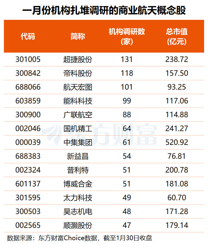 机构关注度方面,共计55只商业航天概念股1月获机构调研,其中,超捷股份、帝科股份、航天宏图均获超百家机构扎堆调研,能科科技有99家机构给予关注,国机精工、普利特等6股的机构调研数均在50至90家之间,太力科技、天合光能、罗博特科、泰胜风能等16股也有超20家机构前往调研。