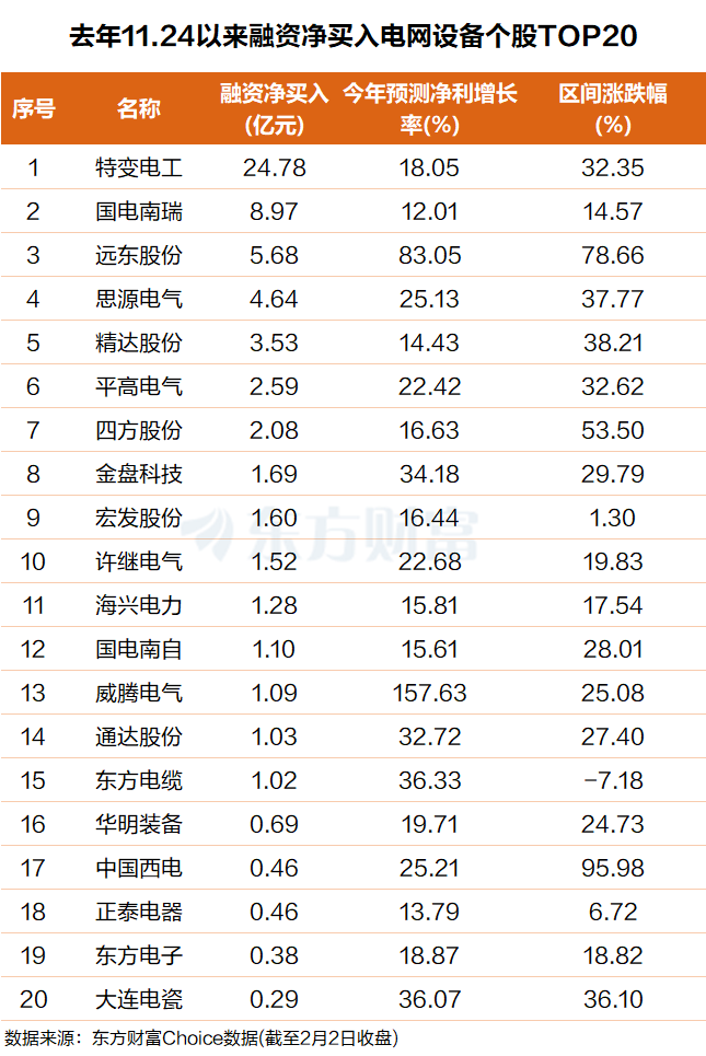 具体来看,特变电工排名第一,融资净买入近25亿元;国电南瑞排名第二,融资净买入近9亿元。