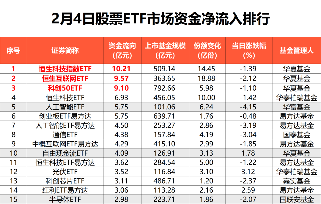具体到指数维度,2月4日,恒生科技指数净流入居前,达28.84亿元,在股票ETF市场流入板块中位居首位;从5日角度观测,资金流入恒生科技指数超69亿元,也是资金净流入最多的方向,净流入科创50指数超47亿元。