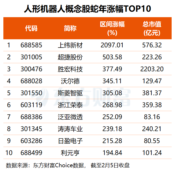 数据显示,共有43只人形机器人概念股在蛇年实现股价翻倍,上纬新材暴涨近21倍居首,公司也是蛇年A股的涨幅王;超捷股份涨超5倍位居次席,沃尔德、斯菱智驱、浙江荣泰、涛涛车业等7股区间涨幅均超2倍以上。