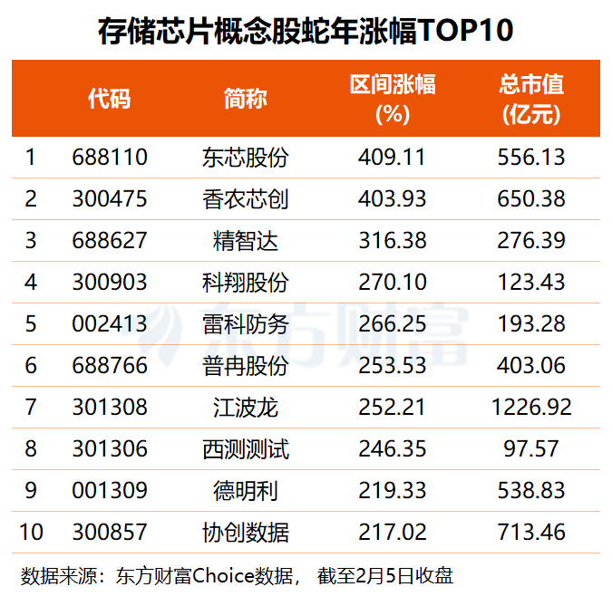 得益于涨价潮持续,存储芯片板块在蛇年迎来超级周期,催化因素主要源于供需格局的失衡:AI算力需求强劲带动存储紧缺,SK海力士、三星电子、美光三大存储巨头将核心资源投向HBM与DDR5,传统存储产品供应缺口扩大,DRAM与NAND Flash现货价格持续飙升;AI服务器、消费电子复苏带动存储芯片需求激增,行业进入补库存周期;国家大基金三期启动,重点支持存储芯片领域国产替代。
