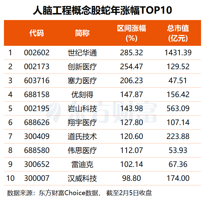 数据显示,人脑工程板块蛇年共有9股实现股价翻倍,世纪华通、创新医疗、塞力医疗累涨超2倍,优刻得、岩山科技、翔宇医疗、伟思医疗等涨幅居前。
