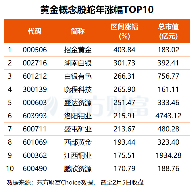 数据显示,共有24只黄金概念股在蛇年股价翻倍,招金黄金大涨4倍,湖南白银涨3倍位居次席,白银有色、晓程科技、盛达资源等5股区间涨幅均超2倍。
