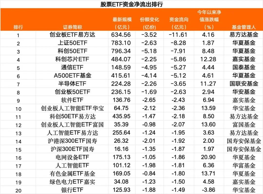 此外,昨日29只股票ETF净流出超过1亿元,创业板、上证50、科创50、A500等宽基主题ETF,以及科创芯片、通信、半导体、软件等行业主题ETF是资金净流出较多的品种。