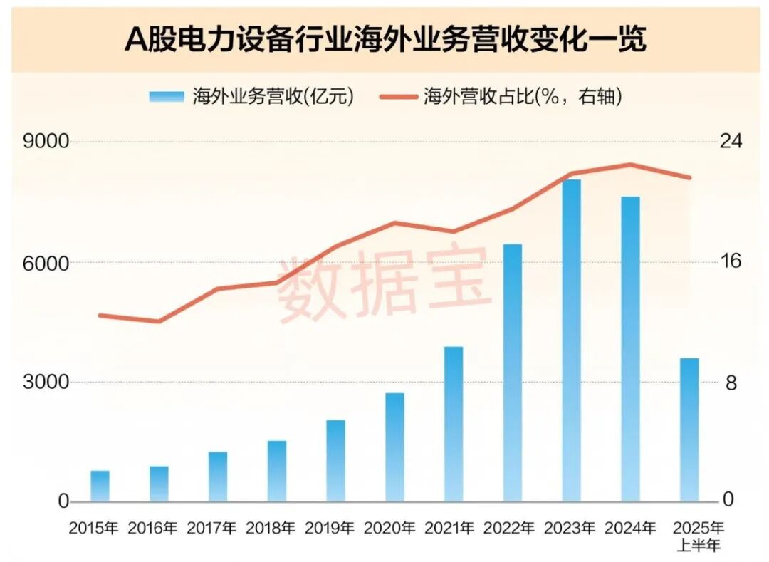 作为产业中坚力量,A股电力设备企业全球化步伐坚定有力。据证券时报·数据宝统计,2024年A股电力设备行业海外业务营收达到7628.84亿元,较2020年增长180.52%;海外营收占比升至22.48%,较2020年提高3.89个百分点。2025年上半年,电力设备行业海外业务营收达到3589.8亿元,占比为21.6%,全球化布局成效持续显现。