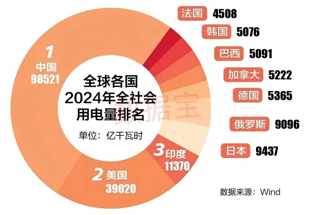 从规模上看,我国全社会用电量已连续10多年位居全球第一。Wind数据显示,2024年我国全社会用电量是第二名美国的两倍多,更是超过第二名至第九名的总和。