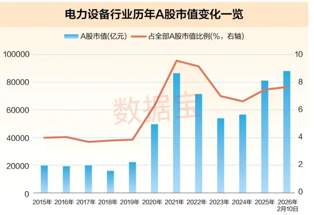 产业层面的迭代升级与跨越式发展,在资本市场上得到充分的价值印证。据证券时报·数据宝统计,截至2月10日,电力设备行业A股市值达到8.81万亿元,按年度计算,行业市值创下历年新高。今年以来电力设备行业日均成交3033.99亿元,占A股总成交比例的10.59%,仅次于电子行业,稳居A股最活跃板块之列,彰显市场对行业发展前景的高度认可。