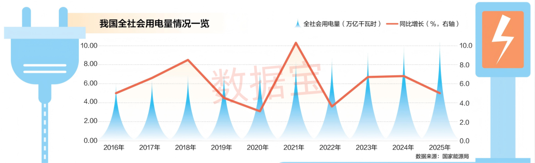 国家能源局数据显示,2025年我国全社会用电量首次突破10万亿千瓦时大关,达到10.37万亿千瓦时,为全球首个10万亿级国家。