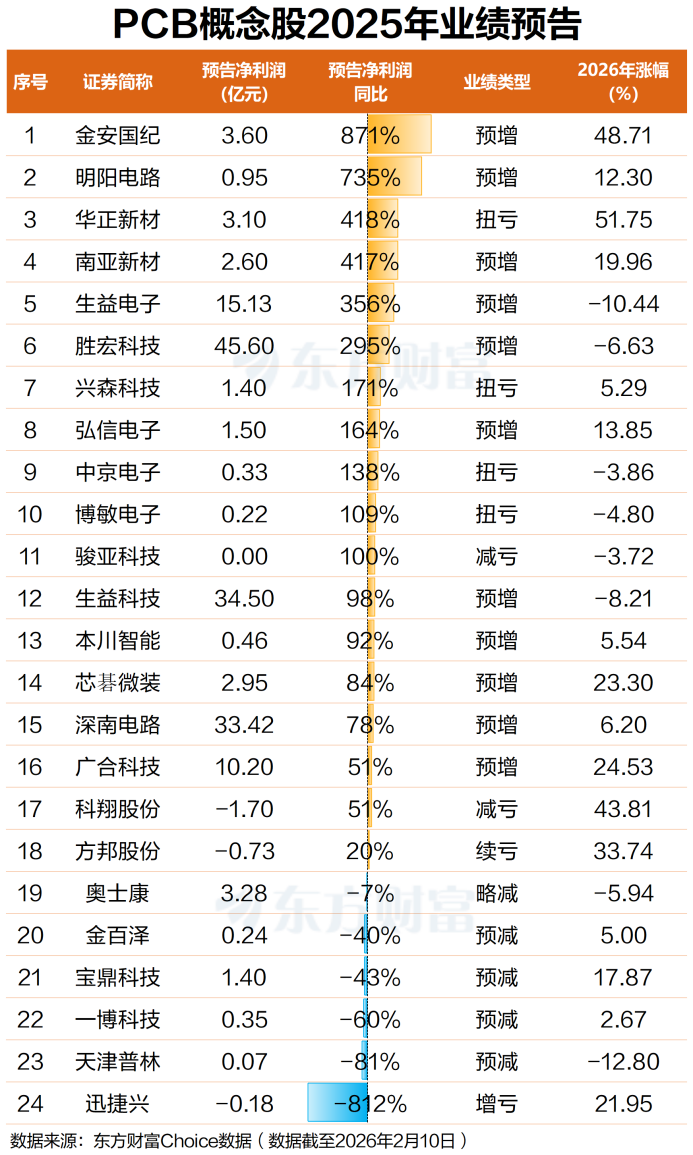 受益于海内外科技巨头AI领域投入加码以及主权AI需求释放等因素驱动,全球AI服务器、交换机、光模块等算力硬件需求持续加大,高多层板、高阶HDI等高端PCB产品持续供不应求。从已披露业绩预告的24家PCB概念股情况来看,其中有18家预计2025年归母净利润同比增长,占比75%,业绩情况整体向好。