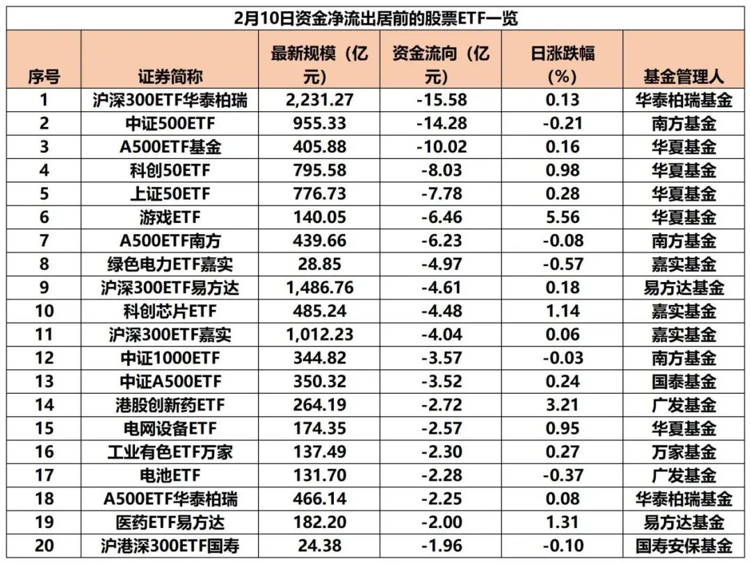 2月10日,市场全天窄幅震荡,传媒、人形机器人等概念股表现活跃。股票ETF资金净流出超百亿元,其中,影视、机器人、卫星等热门主题ETF产品资金净流入居前,沪深300指数、中证500指数等相关宽基ETF成为“失血”大户。